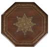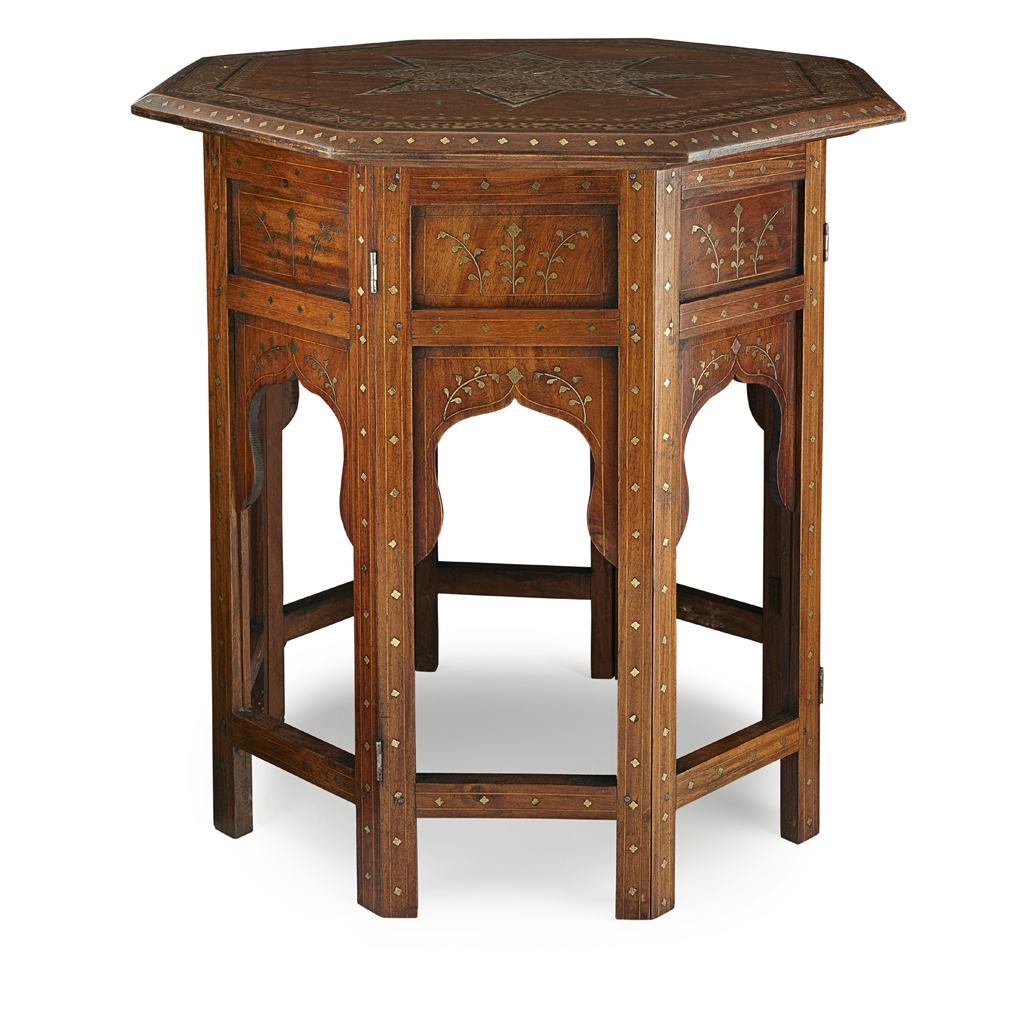 the octagonal top raised on a folding base of matching form, inlaid in brass with an eight-pointed star surrounded by a continuous leafy meander, with paper label for British Empire Exhibition, London 1924, The Punjab Arts and Crafts Depot, Lahore