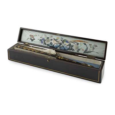 finely embroidered on a beige ground with thirteen butterflies hovering above flowering branches, mounted on gilt and black lacquer sticks decorated with auspicious emblems, with a fitted painted and lacquered box