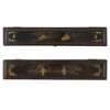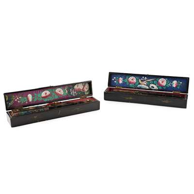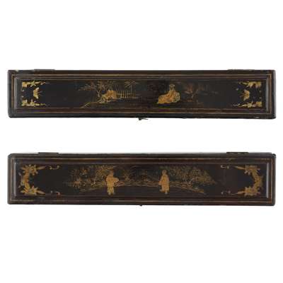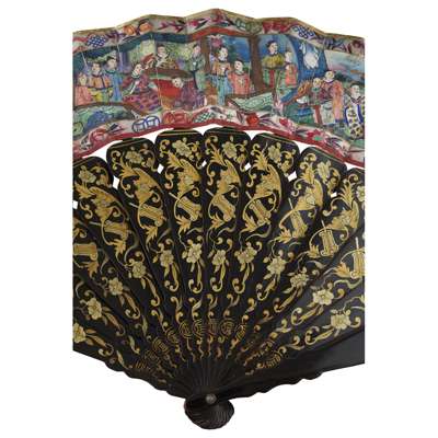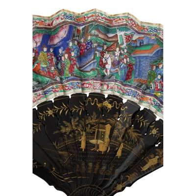 the fan leaves brightly painted on both sides with figures amongst elaborate terraced pavilions, each figure with finely detailed ivory faces and applied silk clothing, the guards and sticks gilt-lacquer decorated against a black ground with figures in a garden, and with Buddhist emblems, each fan with a fitted lacquer box (2)