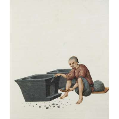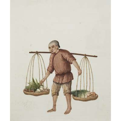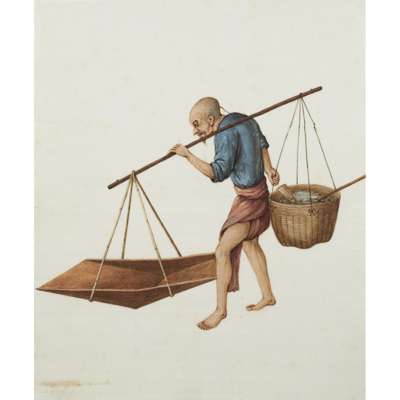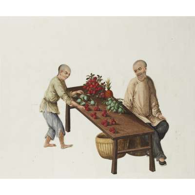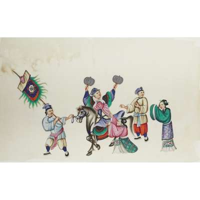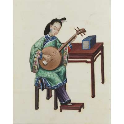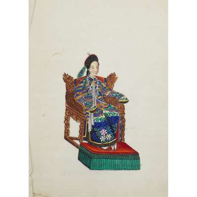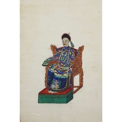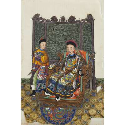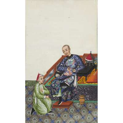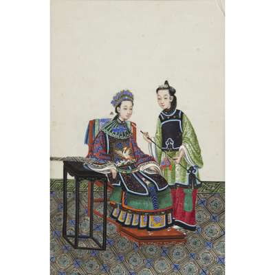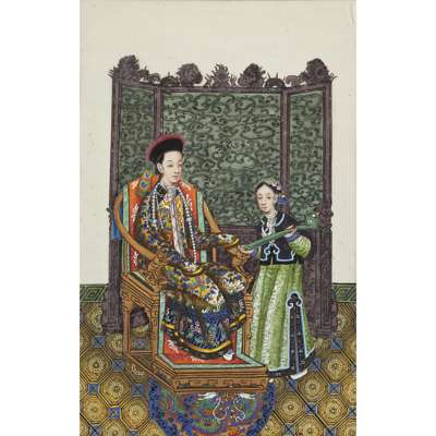 ink and colour on paper, each depicting dignitaries or ladies and attendants in an elaborate interior; together with ELEVEN PAINTINGS ON PITH PAPER, QING DYNASTY, 19TH CENTURY, depicting dignitaries and street vendors (17)