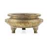 the heavily cast, compressed globular body rising to a short neck with a wide everted lipped rim, supported on three paw feet issuing from lion masks, the masks repeated as the twin handles, the underside cast with an apocryphal six-character Xuande mark within a rectangle