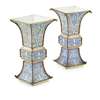 each of square section, the four sides separated by flanges, the lower section enamelled on each side with an archaistic taotie mask below a pair of birds, the taotie masks repeated on the central part, whereas the pairs of birds are repeated on the flaring upper section (2)