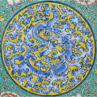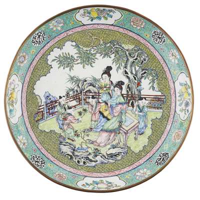 painted in bright famille rose enamels with a leaf-shaped central medallion enclosing two seated beauties receiving gifts from boys, reserved on a yellow diaper ground, bordered by four shaped reserves enclosing flowering and fruiting branches, the underside with floral sprigs centred by a coiled chilong