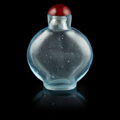 For a similar aquamarine-blue glass snuff bottle from the Mary and George Bloch collection, dated to Qianlong/Jiaqing period, see Sotheby's sale in their Hong Kong rooms on 01.06.2015, lot 127, sale HK0576.