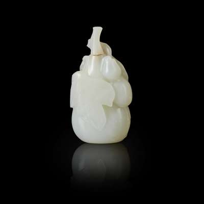 finely carved in the shape of a double-gourd, decorated with a further gourd carved in high relief above a flying bat, the stone of even white colour with two areas of pale russet colour