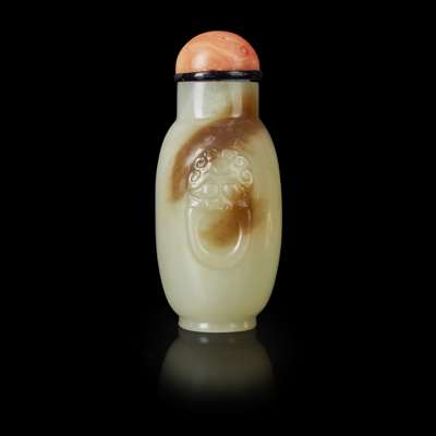of ovoid form, carved in low relief with a taotie mask and ring handle on either shoulder, with a hardstone stopper