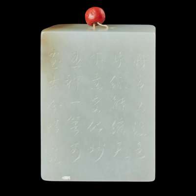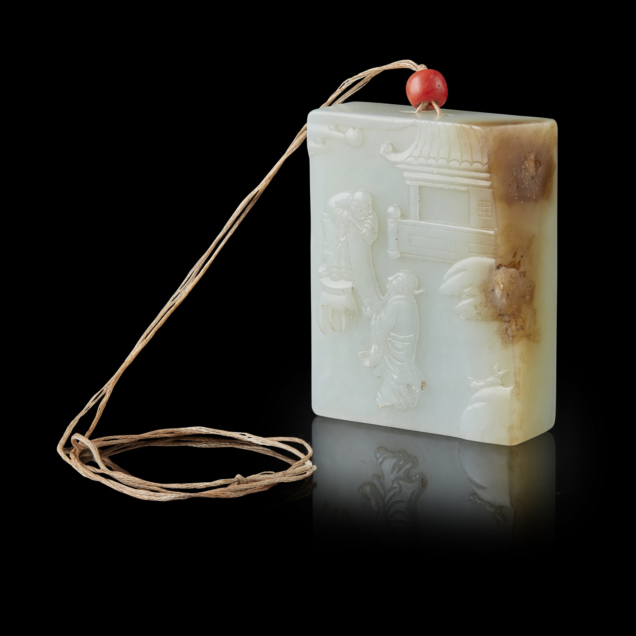 carved from a thick block of white jade, one side carved in relief with two literati appreciating a scroll painting beside a pavilion, the reverse side inscribed with a five-line poetic inscription, the stone of an even pale celadon colour with one side remaining with original brownish skin