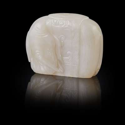 carved as an elephant standing four-square with its head turned sideward with its trunk curled alongside its foreleg, wearing a saddle cloth carved in low relief, the stone of an even white tone