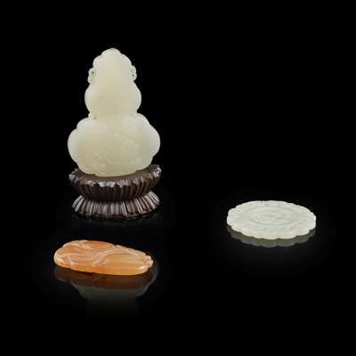 comprising: a white jade in a double gourd form, carved with a symbol of shuangxi (happiness and marriage), the reverse side with similar decoration but showing russet colouring; a pierced jade disc carved with scrolling decoration; and an agate pendant carved as a fruit of flat form