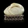 roundedly carved as a goose with the head turned backwards resting gently above the plump body, grasping in its beak a long leafy stem, with finely incised plumage, the greyish green stone with russet patches, on a carved wooden stand