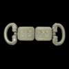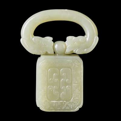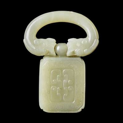 each plaque carved in a rectangular form with corners, the surface incised with key fret motifs, suspending a hinged ring with double dragon heads, the stone of an even green tone
