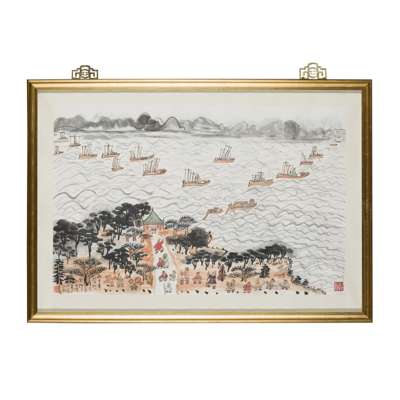 Lake Tai is situated in Wuxi where Fang Zhaoling was born in Jiangsu Province in 1914. She clearly had very fond memories of the lake which is known for its productive fishing industry, and of the fishermen and their fleets of small private fishing boats (as appeared in her painting).