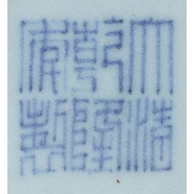 the shallow rounded sides raised on a tapered foot, the body covered in a thick layer of sky-blue glaze, leaving only the foot rim unglazed and revealing the purplish-brown body, the base inscribed with a six-character Qianlong mark in underglaze blue
