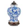 painted with flowering prunus branches on an underglaze blue 'cracked-ice' ground, the neck decorated with ribbon-tied precious objects, with wooden cover and stand