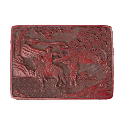 the slightly domed cover carved with a scholar riding on a horse and in conversation with a traveler, the sides of the cover and the box decorated with bamboo leaves and cherry blossom on a square ground