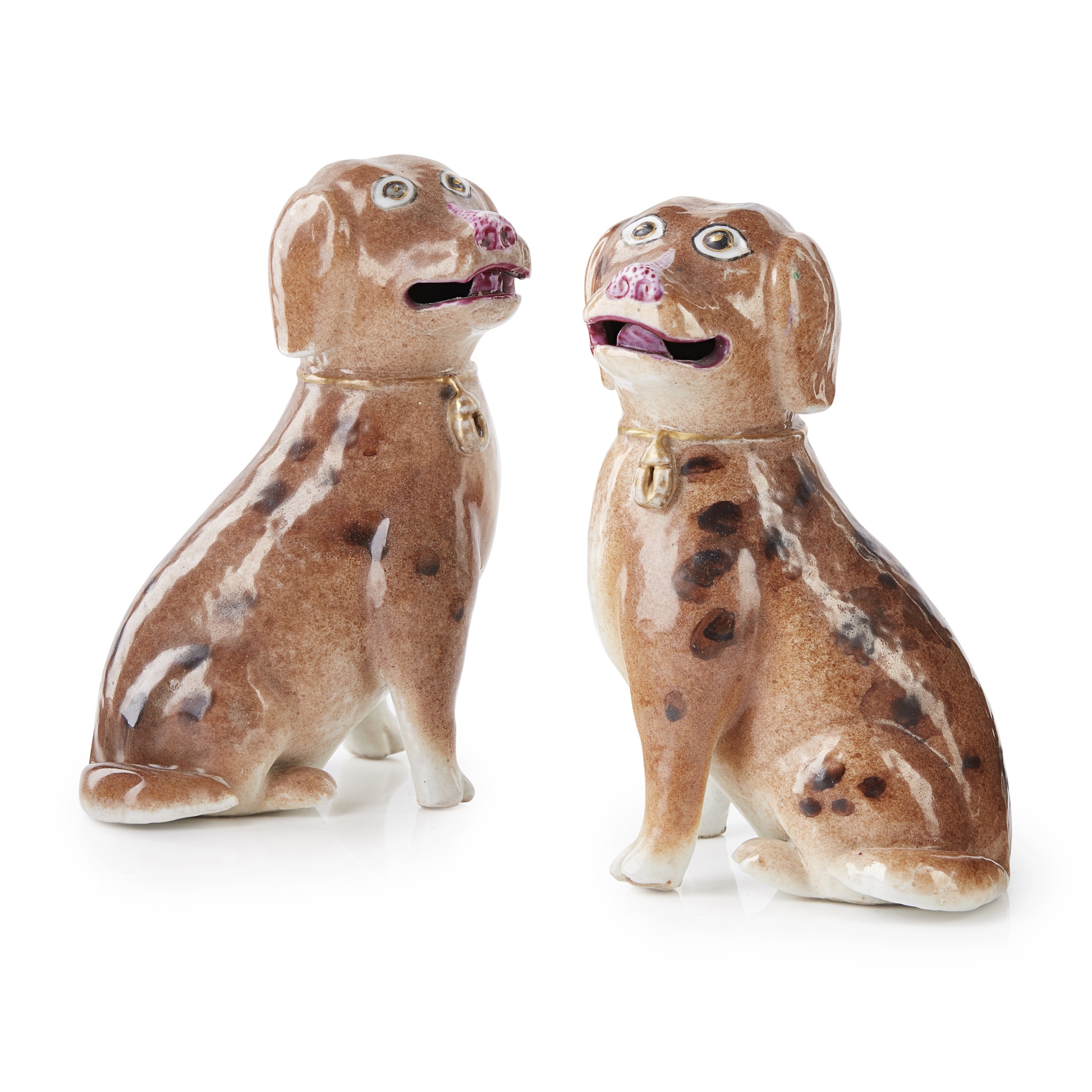 each porcelain spaniel modelled seated with their tails curled around a hind leg and slightly open mouth, each wearing a collar with a gilt bell pendant, their fur naturalistically painted in brown