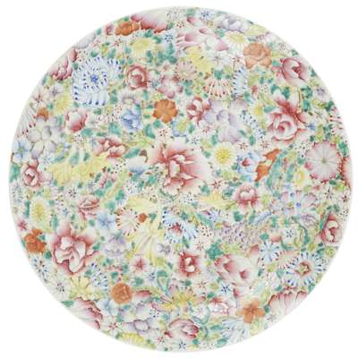 comprising a baluster vase, the bulbous body rising from a short foot to a waisted neck, extending to a large opening of a disc mouth, the body covered entirely by millefleur; and a large charger raised from a tappered foot to a slightly flared rim, the interior decorated with millefleur, the exterior covered in white-glazed and adorned with four flowers; each vessel inscribed with a six-character Qianlong mark in iron red on the base