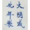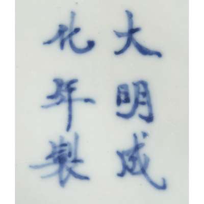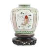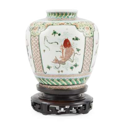 of ovoid form with a flared neck, painted with four panels showing carp and lions, the base inscribed with a six-character apocryphal Chenghua mark in underglaze blue, with a wooden stand