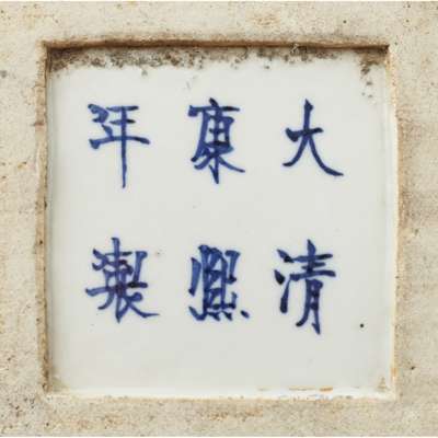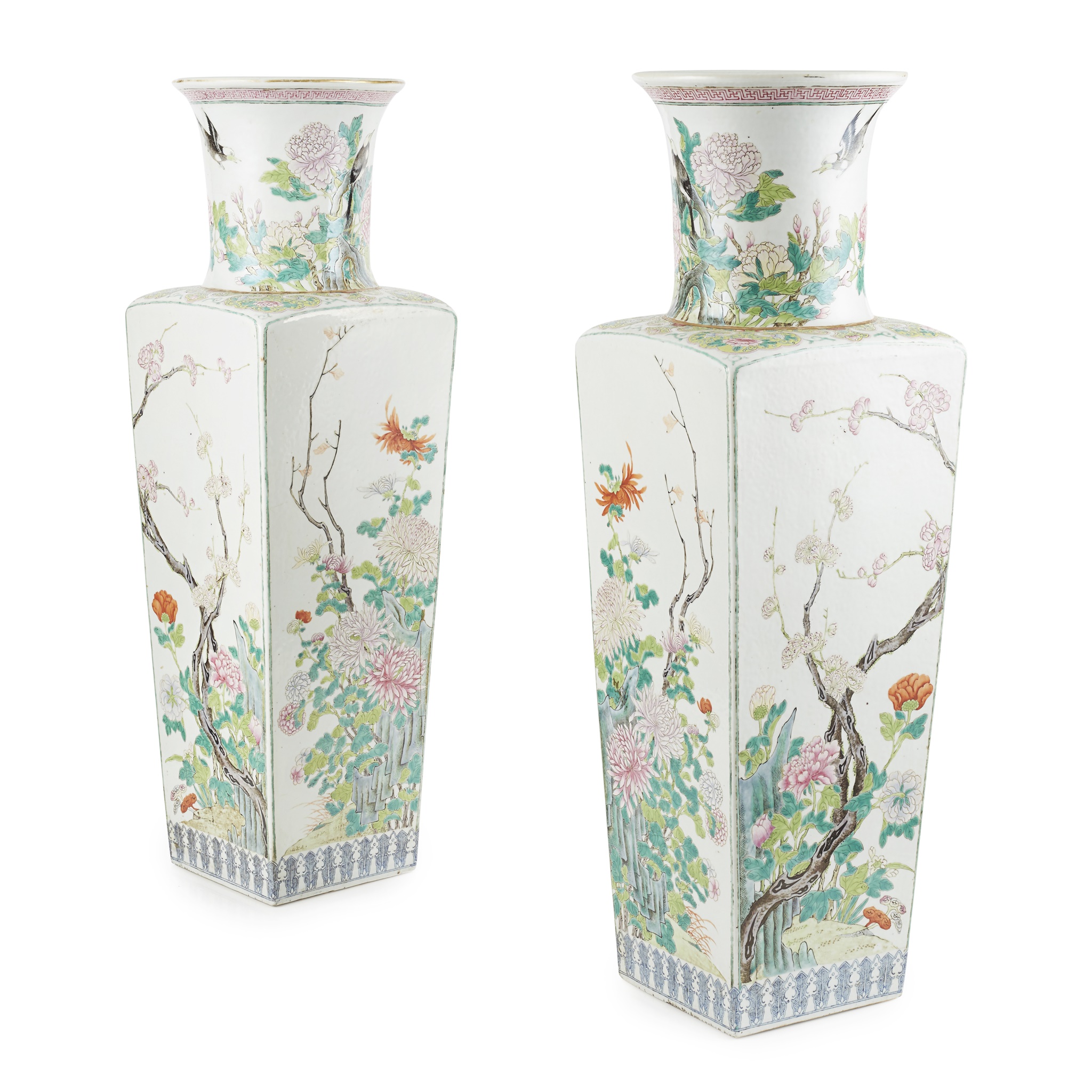 each of square baluster form, the tapered body rising to a slightly splayed neck, painted with chrysanthemum, peony, and lotus flowers, with songbirds to the neck, with wooden stands