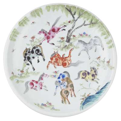 LARGE FAMILLE ROSE 'EIGHT HORSES' CHARGER