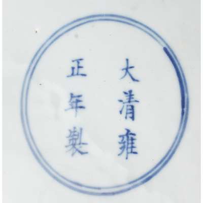 the rounded sides rising from a straight foot to a flared rim, both the interior and exterior painted with eight horses in a mountainous landscape, each horse portrayed as galloping, grazing, walking, or reclining below a weeping willow, the base inscribed with a six-character Yongzheng mark in underglaze blue