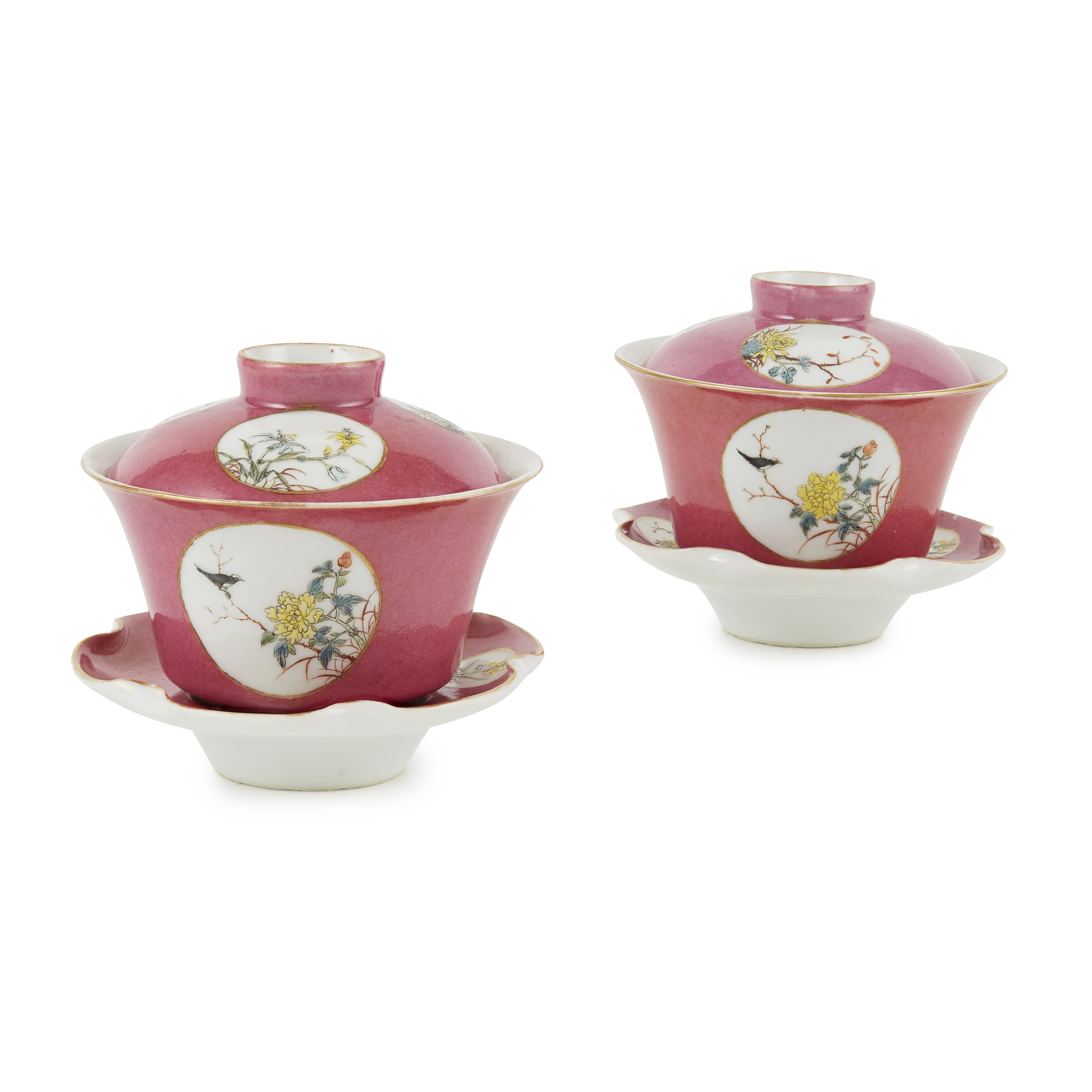 each cup and cover decorated in three cartouches with magpies, orchids, chrysanthemums, and plum blossoms, all against a pink ground, the top of the covers and the base of the flared-rim cups inscribed with a four-character Qianlong mark in red