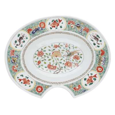 painted to the centre with a phoenix in flight amongst peonies, the sides are painted with panels of fish and shrimp, interspersed with butterflies and flowers