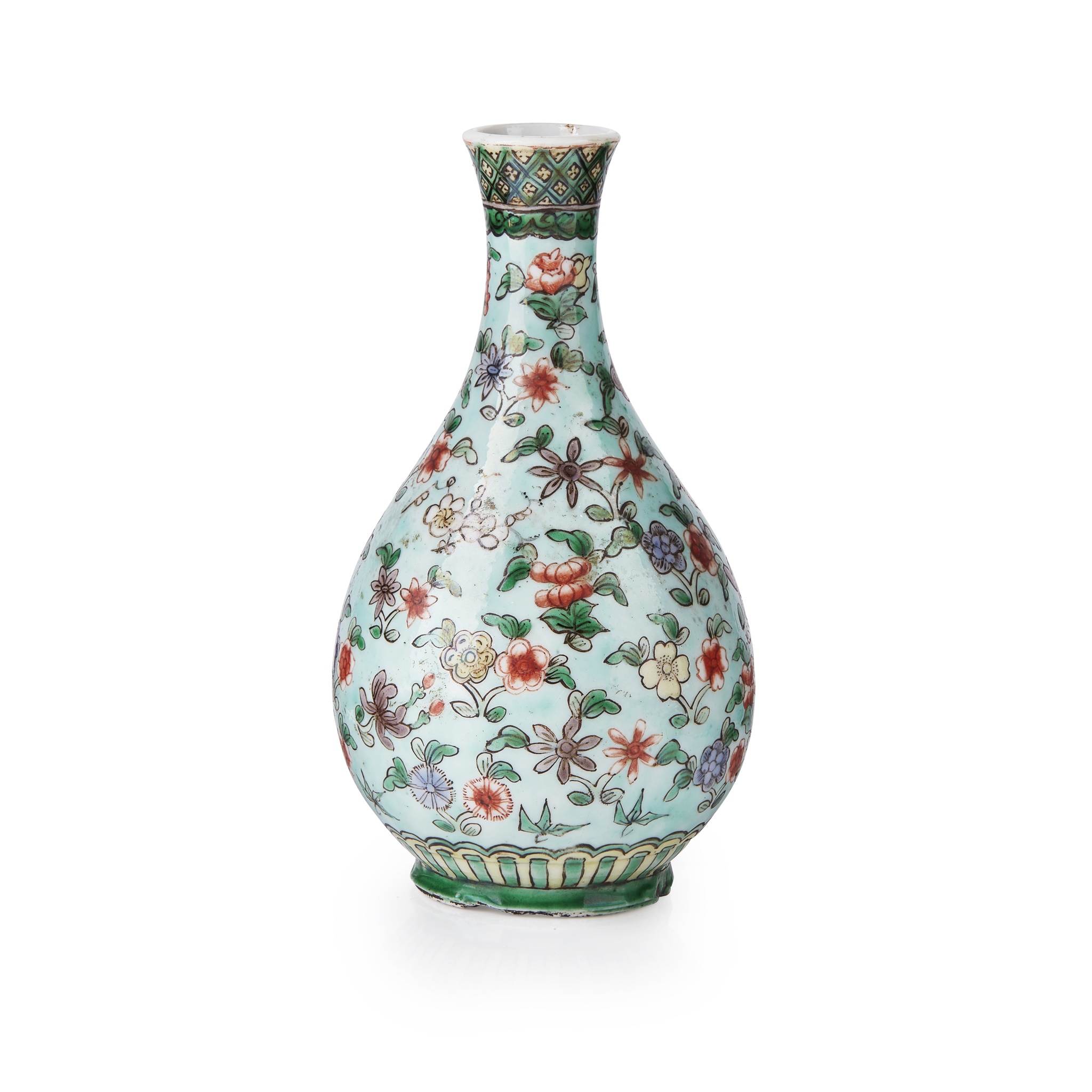 the bulbous body and long neck fully decorated with small flower blossoms on light apple green enamel ground, the flared rim painted with geometric square pattern in green and yellow