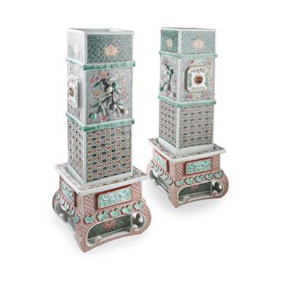 PAIR OF FAMILLE VERTE SQUARE 'ARROW' VASES AND BASES
