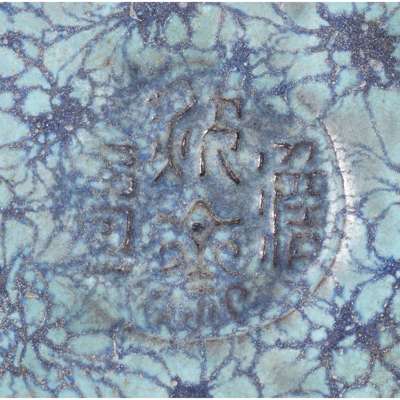 with a tall square body, both the body and the domed cover covered in a thick layer of Jun-glazed fused with light and dark blue colours, the interior and the foot rim revealed the original purplish clay body, the base with a four-character 'Dan Fu Zhai Zhi' mark in archaic script
