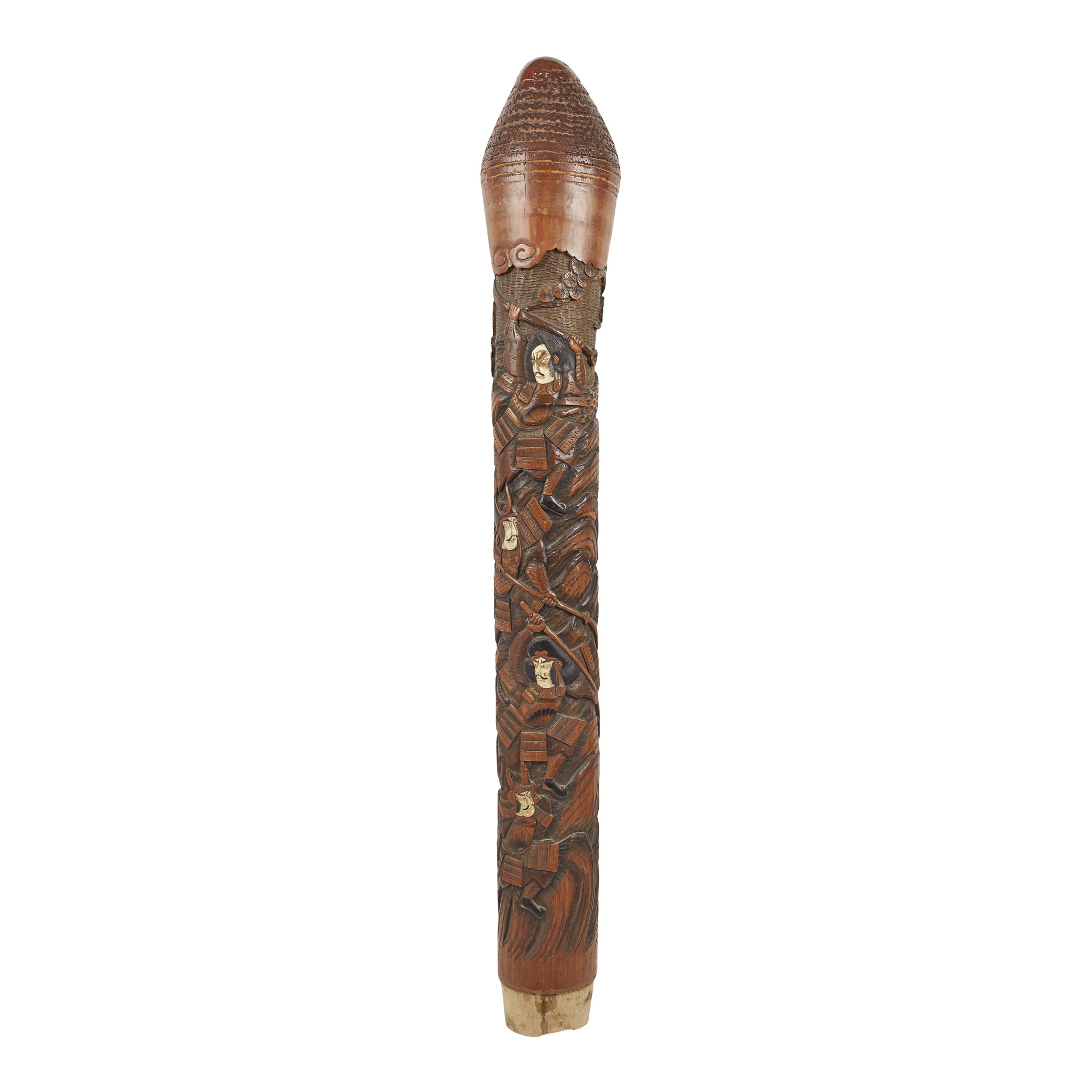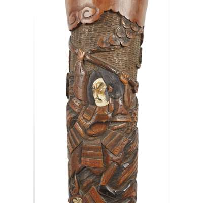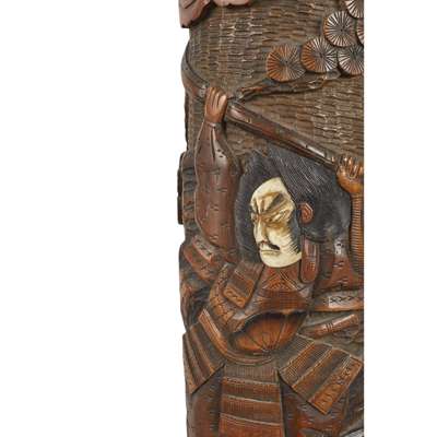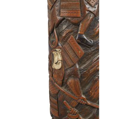 the bamboo body intoxicatedly carved in high relief with an epic armed fight between four samurai holding disparate weapons under a pine tree, the faces of the samurai highlighted with ivory inlay, carved in low relief with austere expressions