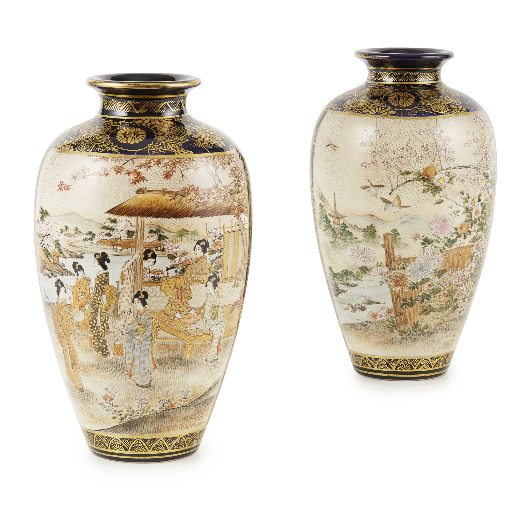 each of cobalt blue with gold outline, painted exquisitely with similar themes in two cartouches: geishas under a maple tree and surrounded by chrysanthemum, peonies, sakura, birds, etc., the base bearing the maker's sign in gold 'Houzan'