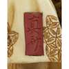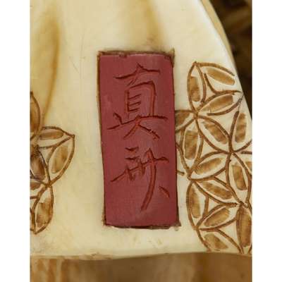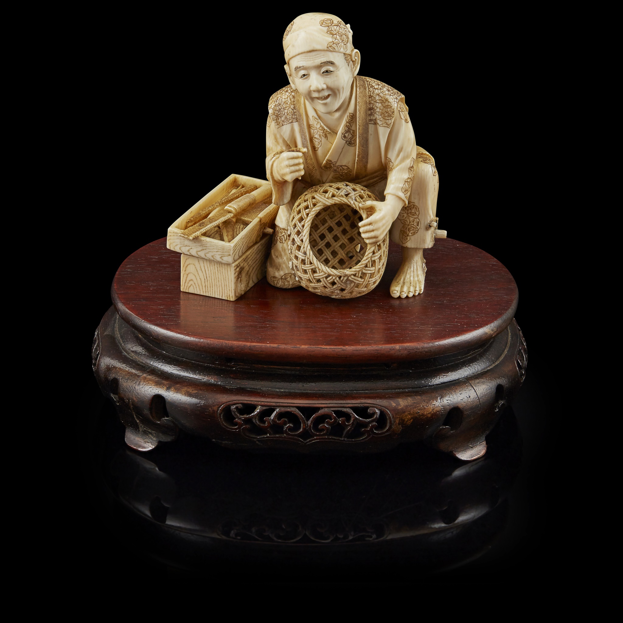 kneeling with a basket and toolbox, a two-character red seal mark to the base, with a carved wooden plinth