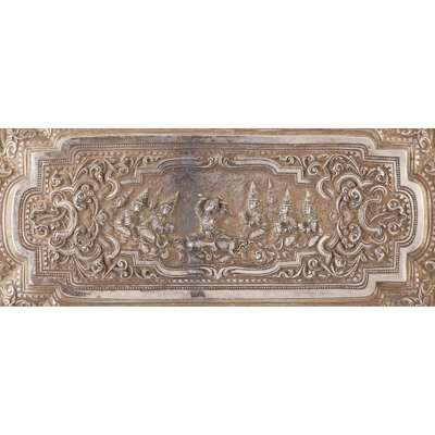 repoussed and chased in dense relief with various courtly scenes which more probably relate to the Jataka, the past lives of the Buddha, the scenes are separated by interlaced foliage