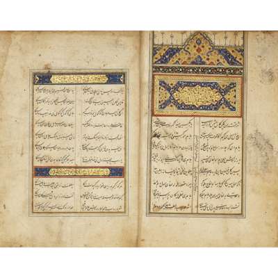 Persian manuscript on paper, 121 leaves, with between ten and twelve lines written in black nasta’liq arranged in two columns with double gold intercolumnar rule, catchwords, text panels outlined in gold and polychrome, some headings in red, opening folio with illuminated header followed by two further panels illumination on the second page, later owners’ notes and stamps, some waterstaining, in fine Ottoman binding