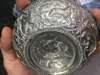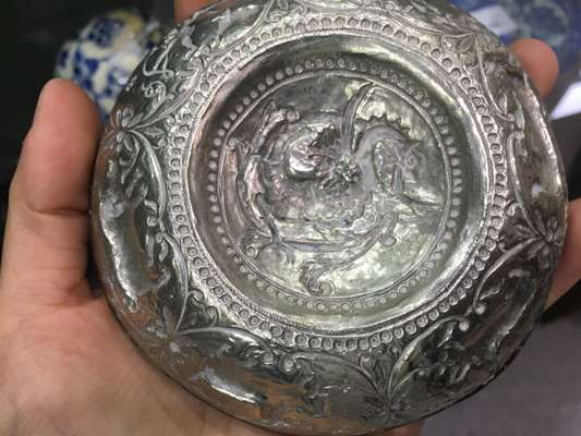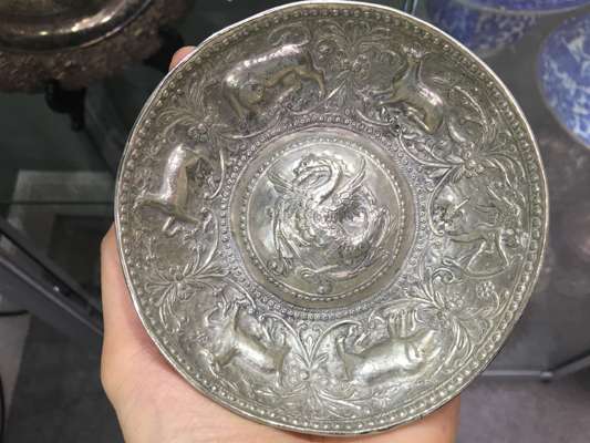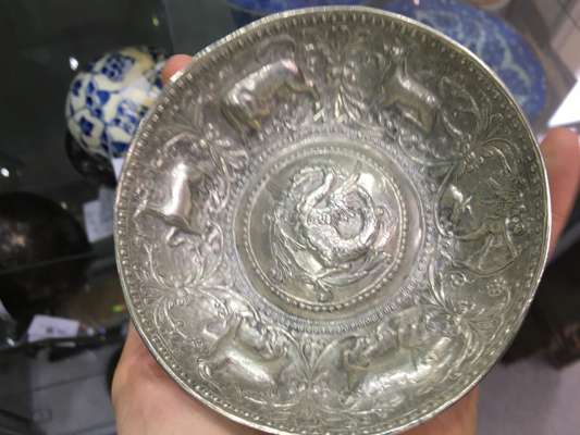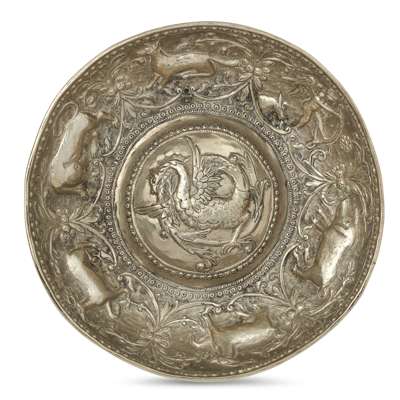 of rounded form with a raised centre decorated with a dragon, the interior sides decorated with various animals in relief including a deer, wolf, wild boar and a winged figure holding a bow and arrow