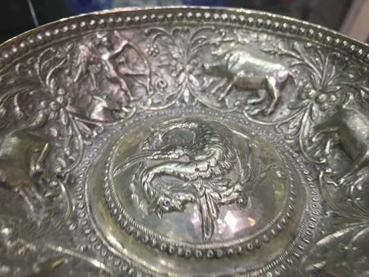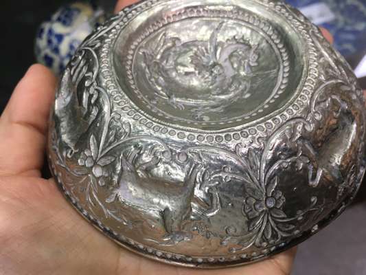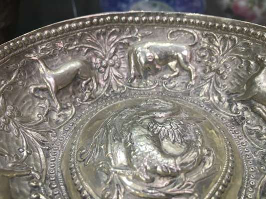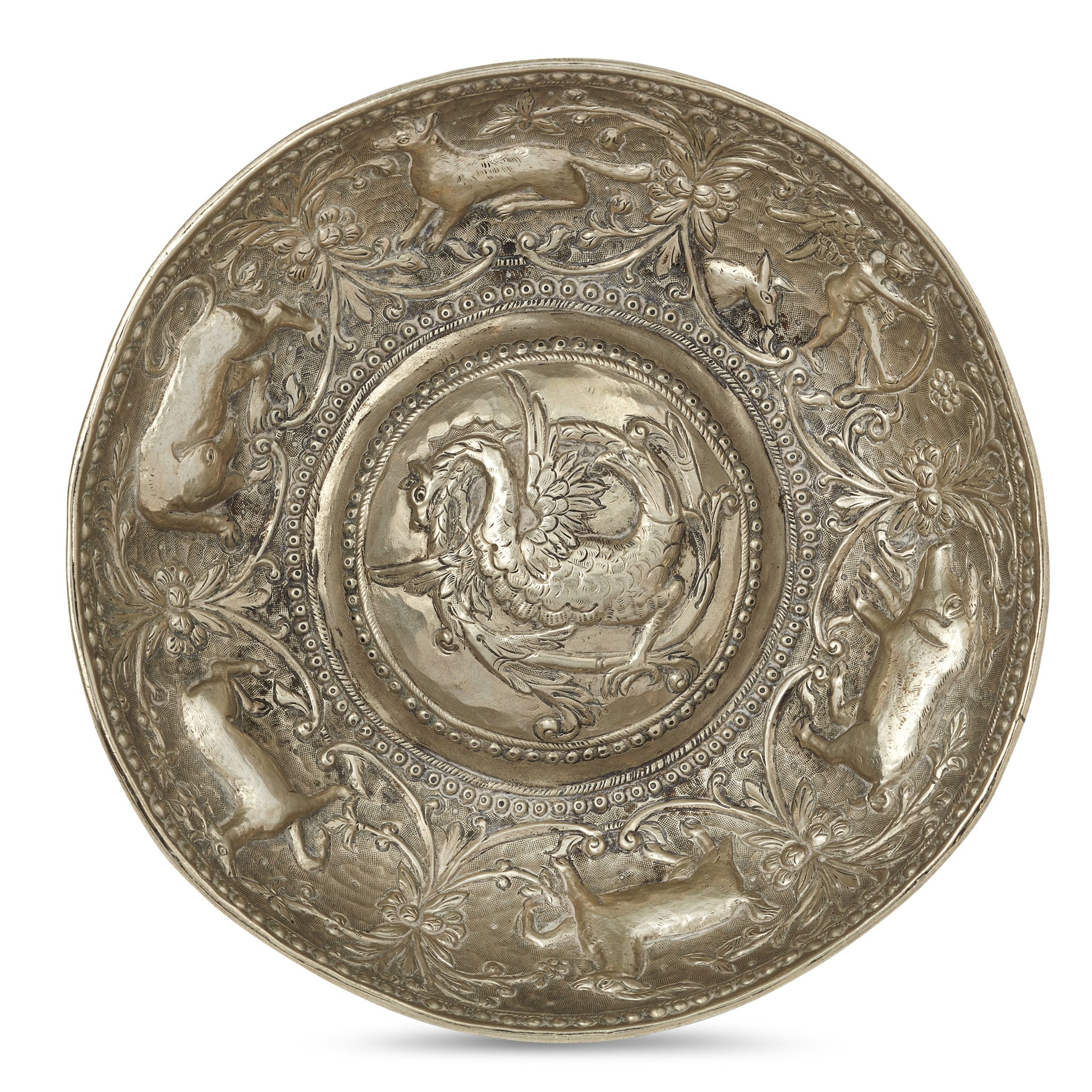 Note: This bowl is a rare and important example of 18th century Ottoman Greek silverware. It is richly decorated with iconography derived both from ancient Greek mythology and the Eastern Orthodox tradition. Each figure has a meaning; the winged figure holding a bow is Eros, symbolic of hope and love; the two deer are symbolic of piety and devotion; the wolf symbolises the founding of pagan Rome; the pig represents forbidden food, and lastly; the dog is symbolic of patience, loyalty and obedience.