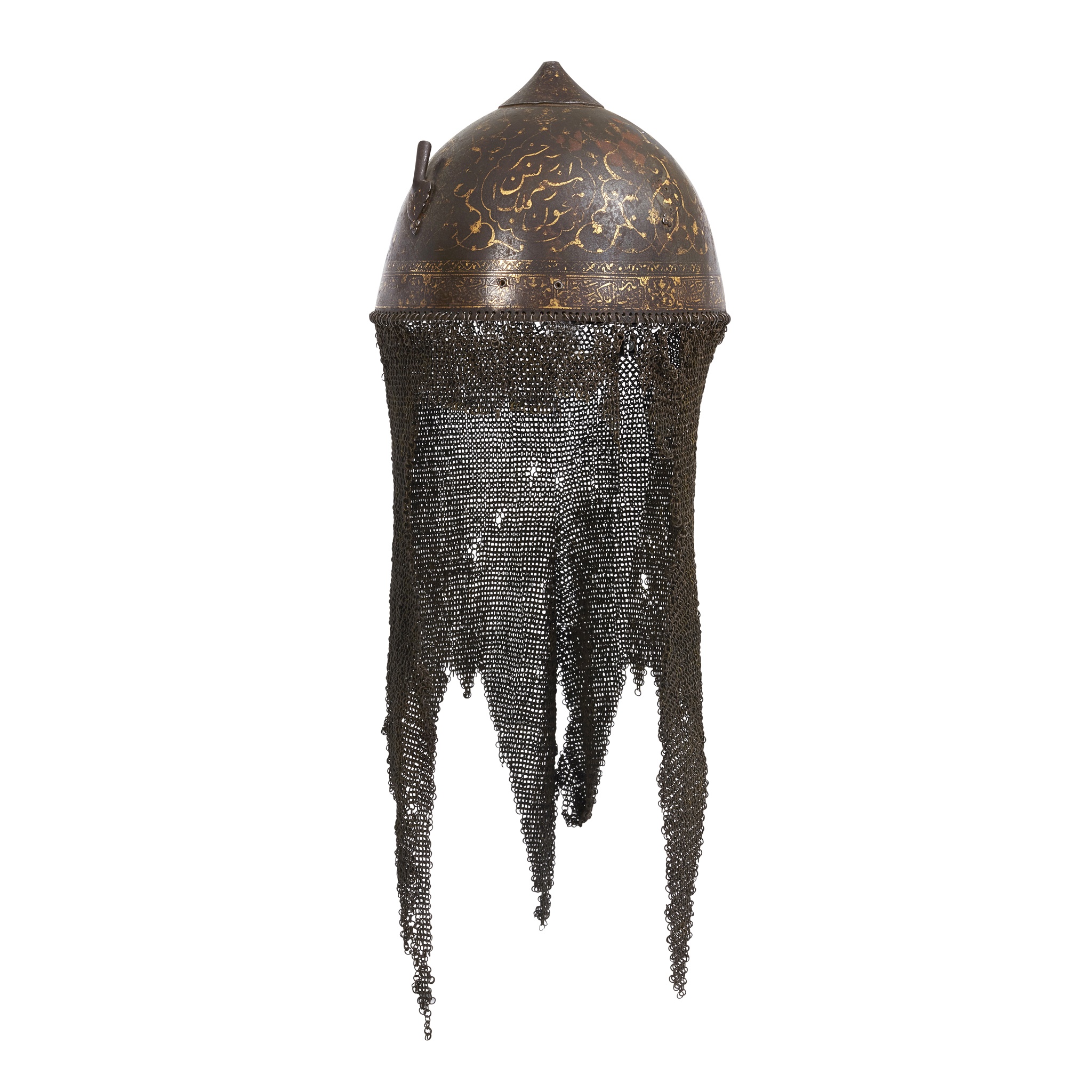 of typical dome-shape with rivetted chain mail attached, the helmet decorated with gold arabesques and a band of nasta’liq inscription-filled cartouches around the rim with one inscription reading ‘mighty souvenir of the exalted…’