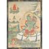 seated in lalitasana on a white lotus seat with her right foot resting on a smaller red lotus, holding a lotus stalk in her left hand raised in abhaya mudra and right lowered in varada mudra, wearing a red dhoti with floral decorations secured with green ribbon topped by a golden belt, accompanied by Yellow Jambhala on the left bottom, and Amitābha on the top amidst an idealized rocky landscape, painted with general pigments and gold on textile