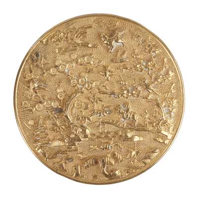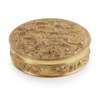 the slightly domed cover and the straight sides both decorated in high relief with figures in a landscape setting, surrounded by various birds, animals and flowers, all on a finely impressed circular ground