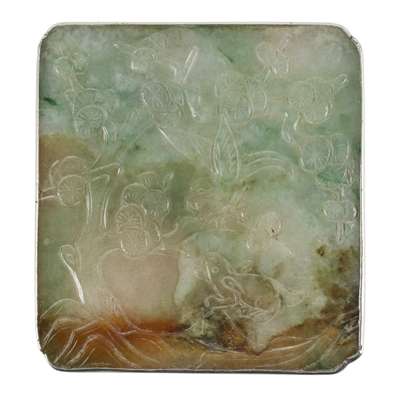 the box of plain sides, the jadeite carved in low relief with a bird perching on a tree, accompanied by a rabbit underneath, the interior of the box and the inner base of the lid walled with wooden panel, the base with a hallmark and marked 'silver'