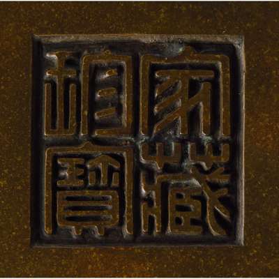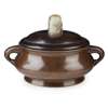 the heavily cast body of compressed globular form, raising from a short splayed foot to a gently flared rim, set with a pair of ring handles, the base with a 'Jia Cang Zhen Bao' mark in a recessed square panel, with a wooden lid mounted with a jade finial adorned with bamboo, pine tree and butterfly decorations