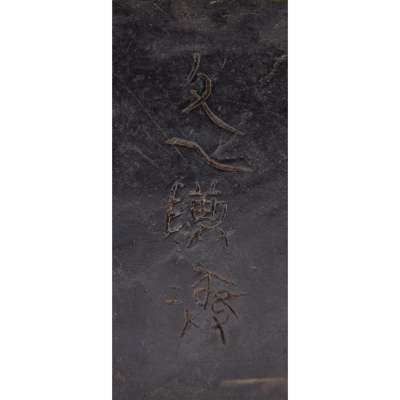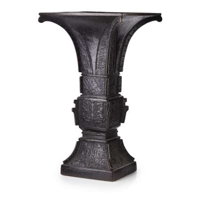 comprising a heavily cast fanggu vase of square body, supported on a splayed foot and flared out with a trumpet neck, decorated with a taotie mask, the sides raised with vertical flanges, the base cast with four characters in archaic script; together with a tear-shaped bronze vase, the well-patinated body decorated with chi dragons and triangular pattern containing taotie mask