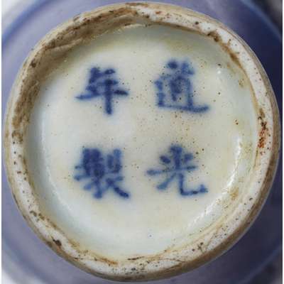 of baluster bottle form, the body decorated intermittently with fu and shou characters, the base inscribed with a four-character Daoguang mark; together with TWO MINIATURE BLUE AND WHITE BOTTLE VASES, decorated with figures and floral patterns respectively