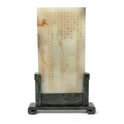 the screen tablet carved in high relief with White-Robed Avalokitesvara standing on lotus petal on ferocious waves, her right hand holding a vase pouring out water, left with a willow twig, the reverse incised and gilded with associated sutra, the stone of translucent pale celadon colour with russet inclusion, fitted on a bespoke carved spinach-green jade stand, in a fitted wooden box