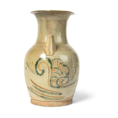 of trumpet-neck baluster form, a short faceted spout attached to the shoulder, the reverse with a long handle connecting mouth and shoulder, the body incised and highlighted with abstract motif in green and brown colour, covered overall with straw glaze stopped neatly near the foot exposing the grey buff body