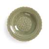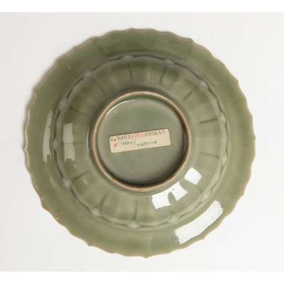 carved to the central medallion with scrolling lotus, near the foliated rim carved with associated-shaped lines, the exterior of the round sides moulded in lotus flower form, covered overall with a glossy celadon glaze thinning especially on the central carving