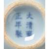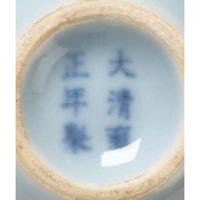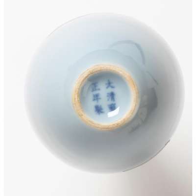 of slender form, the body applied overall with a translucent sky-blue glaze and leaving only the foot rim unglazed, the exterior delicately painted with lotus and leaves in pink and green to one side, the recessed base inscribed with a six-character Yongzheng mark, with collector's label