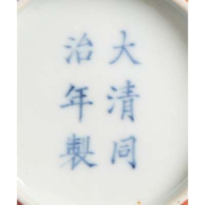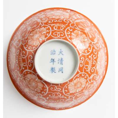 finely potted with deep rounded sides rising from a short straight foot, reserve painted in rich iron-red with flowers with tendrils, the base inscribed with a six-character Tongzhi mark in underglaze blue