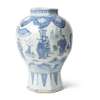 of sectioned-baluster form, painted to the body with officer followed by his entourage in outdoor settings to one side, the other with cloud covering high rocks, underneath a band of lotus-decorated cloud shoulders and above plantain leaves in each section